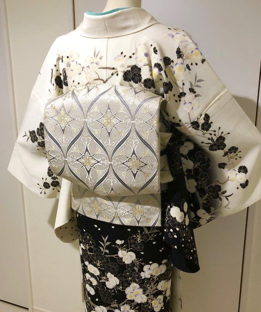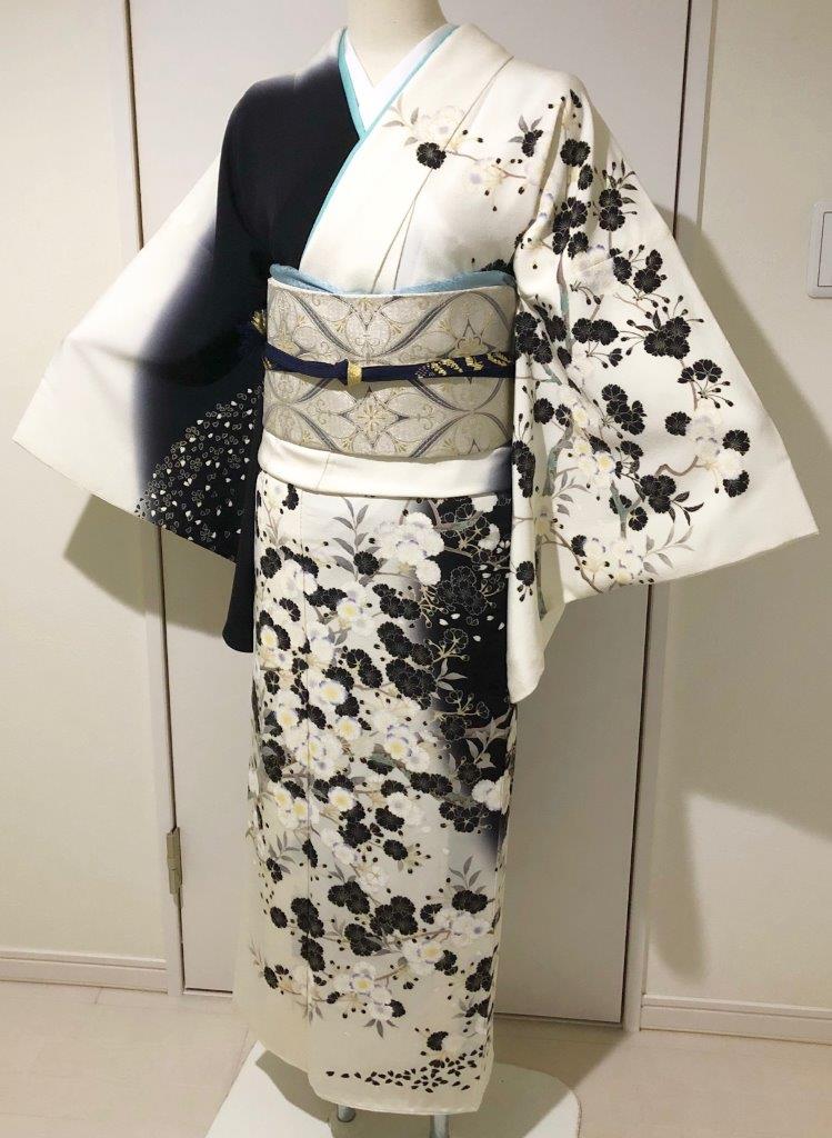 黒白染め分けに桜の訪問着+銀地立涌文様袋帯セット+着付け 65,000円