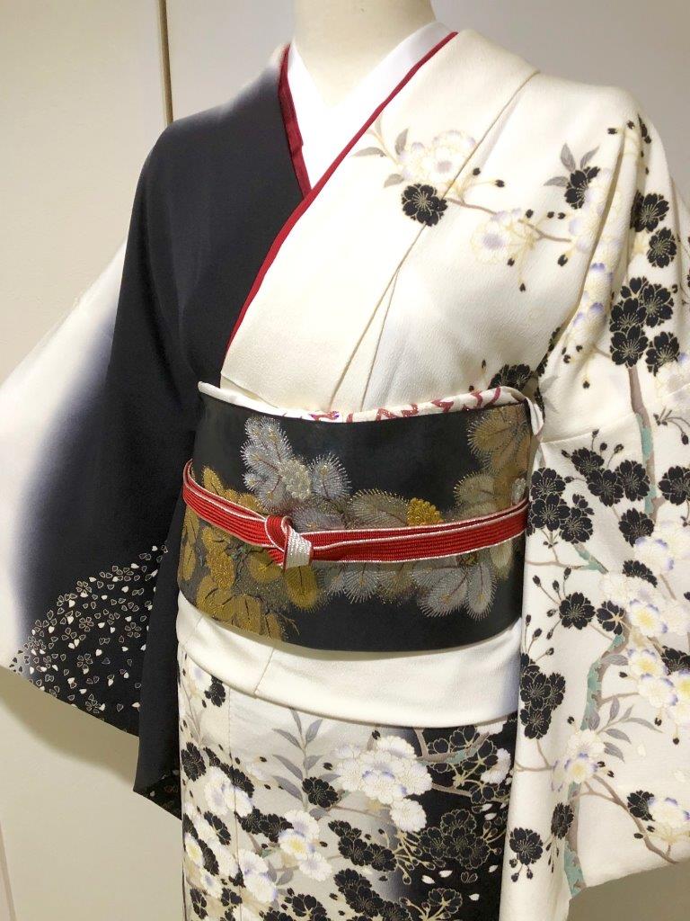 黒白染め分けに桜の訪問着+銀地立涌文様袋帯セット+おすすめ小物+着付け 68,000円