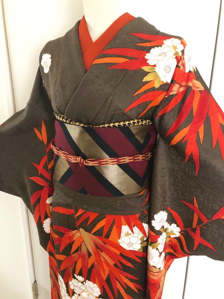 ![]() 鶯茶に朱竹の訪問着セット 50000円 |